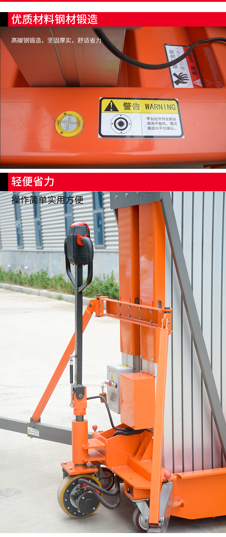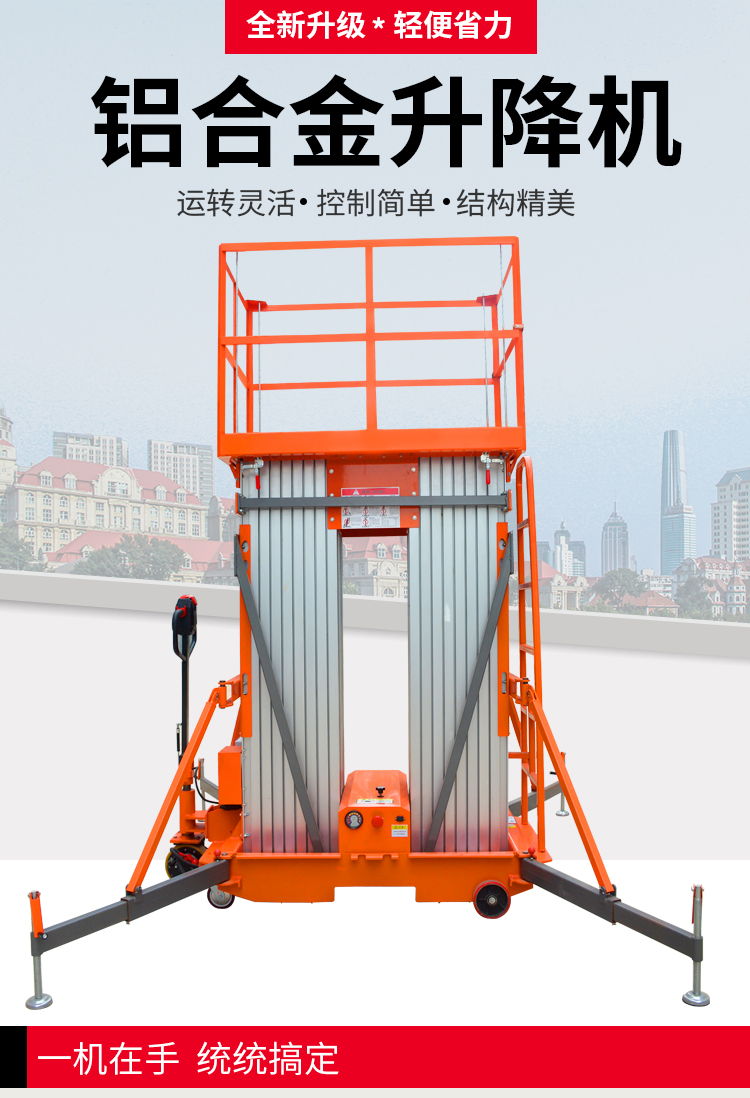 雙柱鋁合金升降機,具有移動靈活、升降平穩、操作方便、載重量大等特點。采用國外和國產液壓泵站。主要適用于工廠、物業單位、商店裝潢、建筑、裝飾、場館館布置、會議中心等行業。