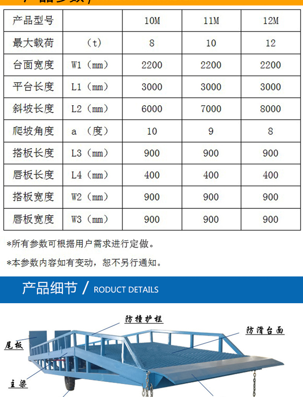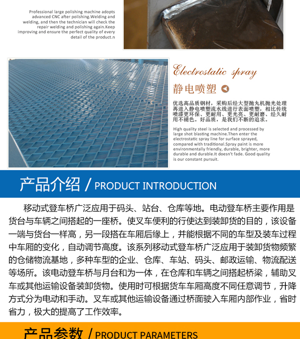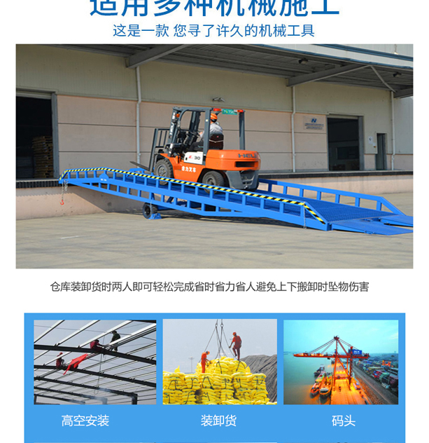 固定式登車橋廣泛應(yīng)用于碼頭、站臺、倉庫等地。電動登車橋主要作用是貨臺與車輛之間搭起的一座橋。使叉車便利的行使達(dá)到裝卸貨的目的,該設(shè)備一端與貨臺一樣高,另一段搭在車廂后緣上,并能根據(jù)不同的車型及裝車過程中車廂的變化,自動調(diào)節(jié)高度。